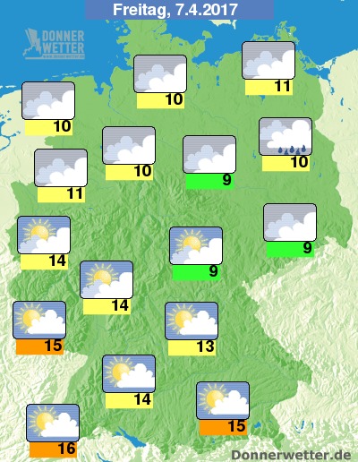 Am Sonntag ist dann auch im Norden die Sonne wieder häufiger mit von der Partie, Schauer bleiben die Ausnahme. Die Temperaturen erreichen im Tagesverlauf Höchstwerte um 12 Grad C in Berlin und um 21 Grad C im Breisgau.