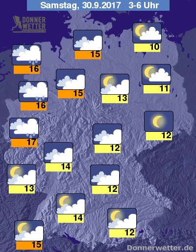 In der folgenden Nacht breiten sich von Westen her dichte Wolken bis über die Landesmitte aus. In den östlichen Landesteilen bleibt es hingegen bei meist lockerem, teils klarem Himmel trocken. Vor allem von NRW bis nach Niedersachsen fällt zeitweise Regen. Die Temperatur sinkt auf 17 Grad in Köln und bis 10 Grad in Stralsund.