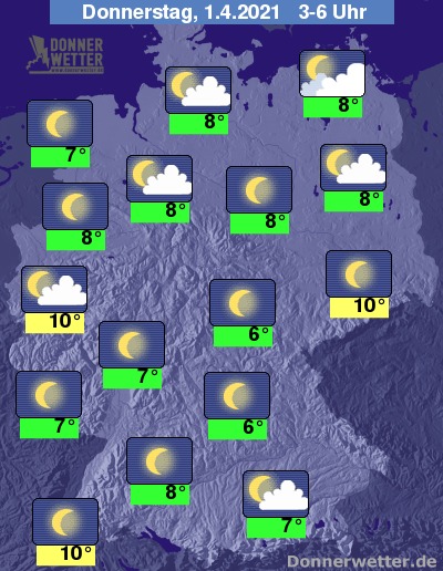 In der folgenden Nacht ist der Himmel überwiegend sternenklar, regional ziehen auch lockere Wolkenfelder durch, dazu bleibt es trocken. Die Temperatur sinkt auf 10 Grad am Oberrhein und bis 6 Grad im Eichsfeld.