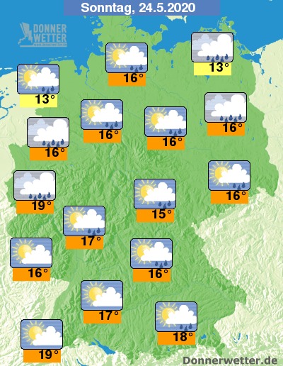 Am Sonntag zeigt sich das Wetter im Süden und Westen teilweise heiter, teils ist es stark bewölkt, dabei bleibt es weitgehend trocken. Im übrigen Bundesgebiet ziehen meist viele und oft dichte Wolken durch, dabei bilden sich zeitweise Schauer. Die Temperatur erreicht 13 Grad an den Küsten und bis 19 Grad am Oberrhein.