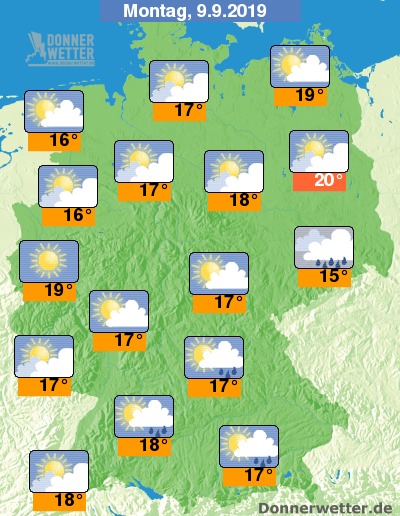 Am Montag bleibt es über dem Süden und über Sachsen meist stark bewölkt und es bilden sich hier gebietsweise Schauer. Im Rest der Republik ist es dagegen meist heiter bis aufgelockert, zum Teil auch stark bewölkt, dabei jedoch trocken. Die Temperatur steigt auf 15 Grad in der Lausitz und bis 20 Grad in Berlin.