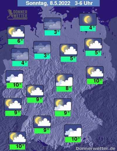 In der Nacht zum Sonntag klingen letzte örtliche Schauer im Süden und der Mitte Deutschlands rasch ab und vor allem im Norden ist es oft sternenklar. Im übrigen Land ist es meist locker bis aufgelockert bewölkt. Die Temperatur sinkt auf 10 Grad in Dresden und 3 Grad in Hannover.