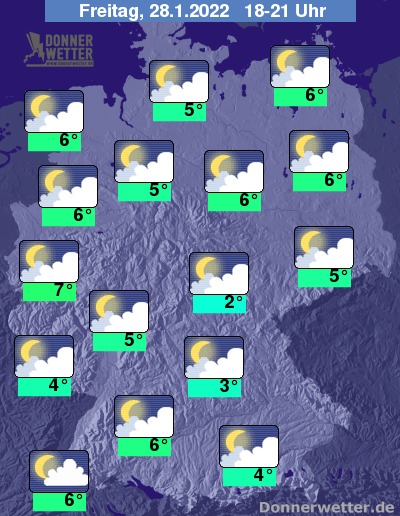 Heute Abend ist der Himmel teils stark, teils aber auch aufgelockert bewölkt, dazu bleibt es überall trocken. Die Temperatur liegt bei 2 Grad in Erfurt und bis 7 Grad in Bonn.