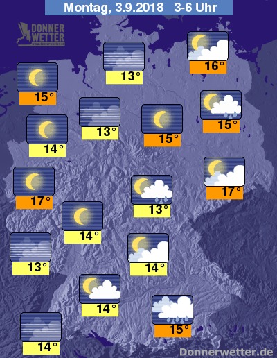 In der kommenden Nacht bilden sich im Südosten, jedoch auch vom Thüringer Wald bis zum Erzgebirge vielerorts Schauer und einzelne Gewitter. Im Süden und Osten ist es oft locker, teils aber auch stärker bewölkt und dazu meist trocken. Im übrigen Land ist es sternenklar, dazu bleibt es trocken. Die Temperatur sinkt auf 17 Grad im Rheinland und bis 13 Grad in der Norddeutschen Tiefebene.
