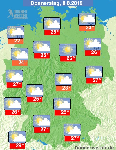 Der Donnerstag ist oft sonnig, teils gibt es einzelne Quellwolken am Himmel. Im Norden sind vereinzelte Schauer um Ostfriesland, der Ostseeküste und Berlin zu erwarten. Sonst bleibt es meist trocken. Die Temperaturen erreichen 25 Grad in Hamburg und bis zu 29 Grad am Bodensee.