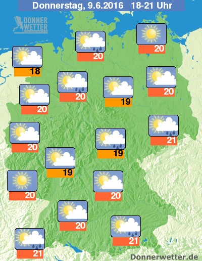 Heute Abend lockert die Bewölkung in weiten Landesteilen auf, über Sachsen, Thüringen und im äußeren Süden der Republik sind jedoch noch vereinzelt Schauer und seltene Gewitter unterwegs, sonst zeigt sich neben überwiegend lockeren Wolken häufig die Sonne und es bleibt trocken. Die Temperatur liegt bei 18 Grad in Ostfriesland und 21 Grad in Nürnberg.