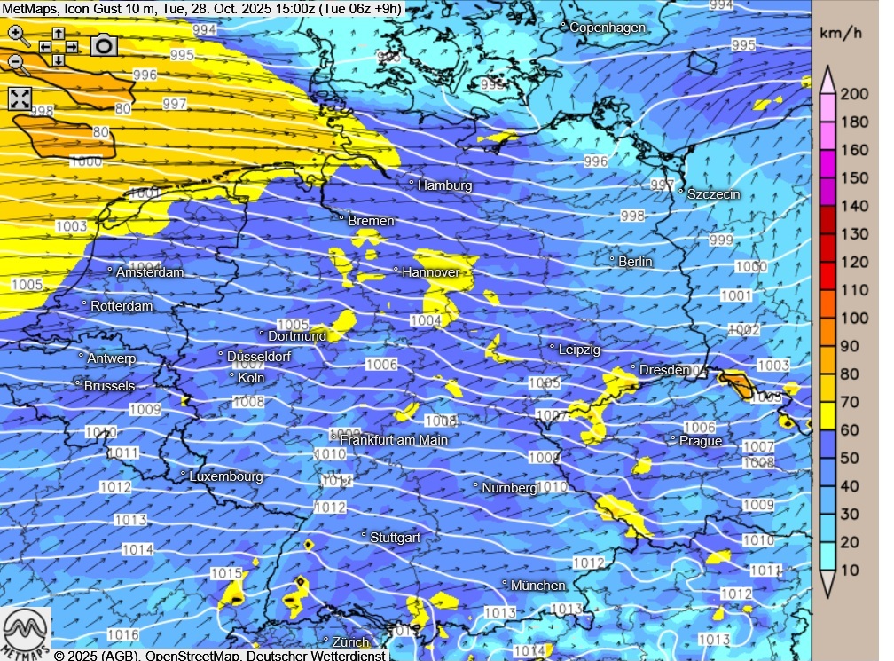 Die Böen- und Temperaturkarte für Dienstagnachmittag (15:00 Uhr) nach ICON: