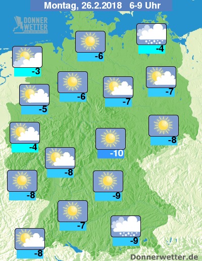 Die neue Arbeitswoche startet dann mit einem meist trockenen Mix aus Sonne und Wolken, an der Ostsee sowie am Alpenrand können zeitweise auch mal einzelne Schneeschauer fallen. Der Wochenauftakt verläuft dabei bitterkalt: Die Höchstwerte am Morgen liegen bei -10 bis -3 Grad C.