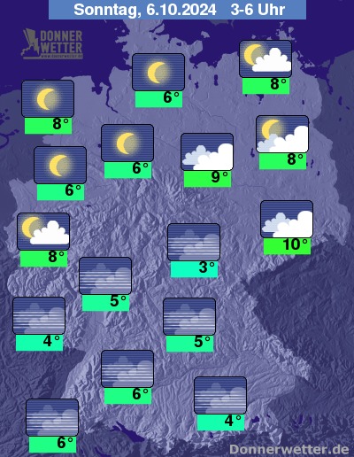 In der Nacht zum Sonntag halten sich im Osten noch meist dichte Wolken. Im übrigen Bundesgebiet klart der Himmel verbreitet auf oder es ziehen noch ein paar lockere Wolkenfelder durch, dazu bleibt es trocken. Die Temperatur sinkt auf 10 Grad in Dresden und bis 3 Grad in Nürnberg.