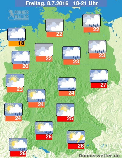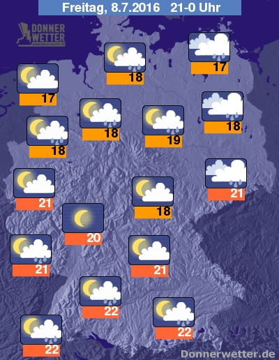 Am späten Abend dominieren dann lockere Wolkenfelder den Himmel, entlang der Oder ist es auch bedeckt. Mit Schauern muss in weiten Teilen des Landes gerechnet werden, ein meist trockener Abend kündigt sich vor allem für die Region zwischen Rheinland und Bayerischem Wald an.