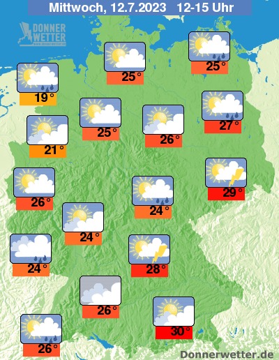 Heute Nachmittag ist es besonders im Süden oft stark bewölkt und hier bilden sich vielerorts Schauer sowie einzelne Gewitter. Im übrigen Land ist es oft heiter, teils ziehen aber auch einige Wolken durch, dabei sind lokale Schauer und seltene Gewitter möglich. Die Temperatur liegt bei 19 Grad an der Nordsee und bis 30 Grad in Oberbayern.