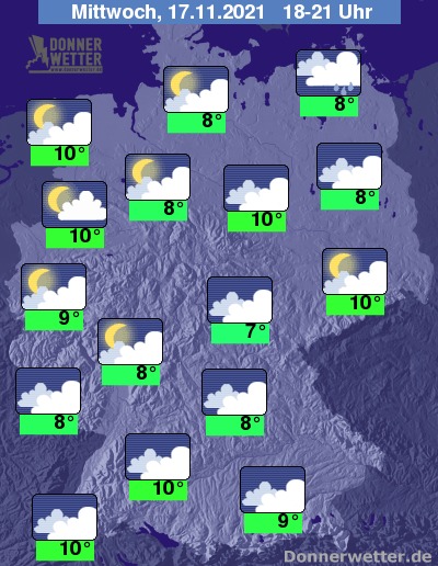 Heute Abend ziehen überwiegend dichte Wolken durch, dazwischen kann es aber auch mal etwas auflockern. An den Küsten bilden sich einzelne Schauer, zudem weht hier ein teils stürmischer Wind. Im übrigen Bundesgebiet bleibt es trocken bei Werten von 7 Grad in Erfurt und etwa 10 Grad in Stuttgart.