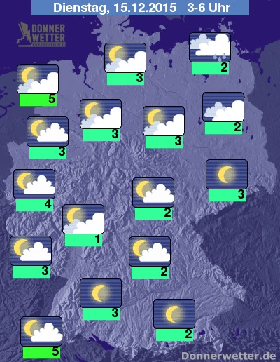 In der folgenden Nacht halten sich über dem Nordosten meist dichte Wolken und es fällt zeitweise Regen oder Sprühregen, zum Teil mischen sich auch ein paar Schneeflocken in den Regen. Im Süden Deutschlands sowie in Sachsen zeigt sich der Himmel meist sternenklar. Im übrigen Bundesgebiet ist es locker oder aufgelockert bewölkt, dazu bleibt es trocken. Die Temperatur sinkt auf 5 Grad an der Nordseeküste und bis 1 Grad am Westerwald.