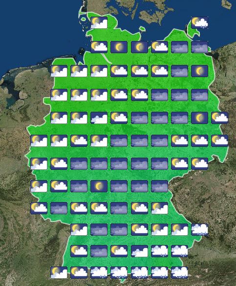 In der Nacht zum Mittwoch halten sich am Alpenrand und Südbayern dichte Wolken aus denen zeitweise Regen fällt. In einem breiten Streifen vom Südwesten bis nach Nordostdeutschland zeigt sich der Himmel meist sternenklar, sonst ist es überwiegend wechselnd oder aufgelockert bewölkt, jedoch trocken. Die Temperatur sinkt auf 13 Grad in Stralsund und bis 4 Grad am Thüringer Wald.
