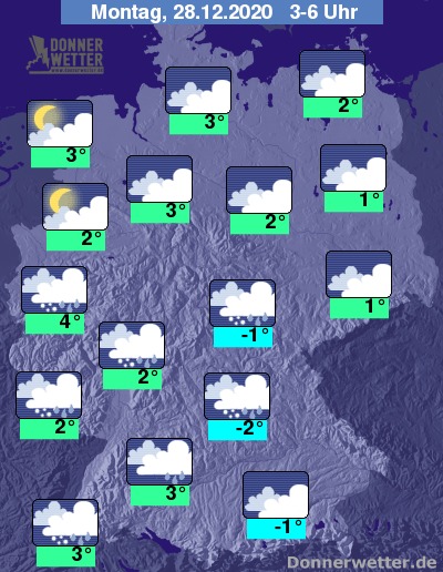 In der Nacht zum Montag bleibt es bis auf seltene Ausnahmen bedeckt und vor allem über der Westhälfte des Landes fällt wiederholt Schnee, Schneeregen oder Regen. Überwiegend trocken bleibt es in den östlichen Landesteilen. Die Temperatur sinkt auf 4 Grad im Rheinland und bis -2 Grad in Mittelfranken. An der Ostsee weht noch teils stürmischer Wind.