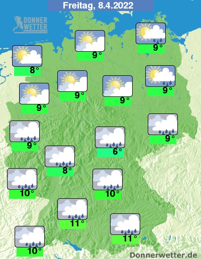 In der Nacht zum Freitag lockert es im Norden gebietsweise auf, teils ist es hier aber auch stark bewölkt und es bilden sich einzelne Regen- oder Schneeschauer. Im übrigen Land fällt unter dichten Wolken zeitweise Regen. Die Temperatur sinkt auf 11 Grad in München und etwa 2 Grad in Berlin. Im Norden und Osten ist es verbreitet stürmisch, an der See und auf den Bergen herrscht vielerorts Sturm. Über der Südwesthälfte des Landes ist es dagegen deutlich ruhiger.