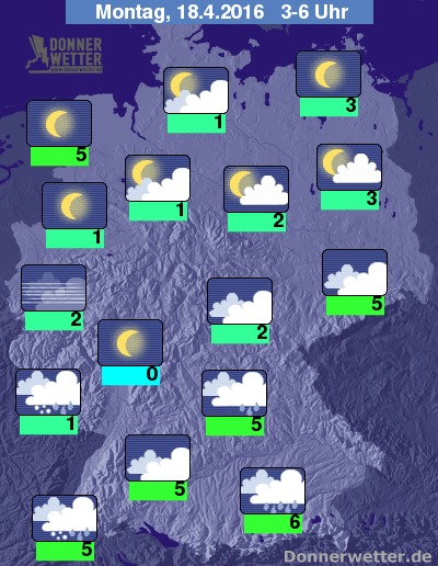 In der Nacht zum Montag bleibt der Himmel über dem Süden weitgehend bedeckt und es fällt weiterhin zeitweise, am Alpenrand auch langanhaltender Regen. Vom Osten bis zur Landesmitte ist es mehrheitlich dicht bewölkt, jedoch trocken. Im Norden und Westen ist es überwiegend sternenklar, hier und da sind auch lockere Wolken möglich, dabei bleibt es trocken. Die Temperatur sinkt auf 6 Grad in München und bis 0 Grad am Westerwald.