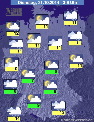 In der Nacht zum Dienstag fällt besonders am Alpenrand noch teils anhaltender und kräftiger Regen, sonst ist es meist aufgelockert, gebietsweise aber auch stark bewölkt und es fällt gelegentlich Regen. Stellenweise bildet sich Nebel oder Dunst. Die Temperatur sinkt auf teils 14 Grad im Breisgau und bis 7 Grad am Taunus.