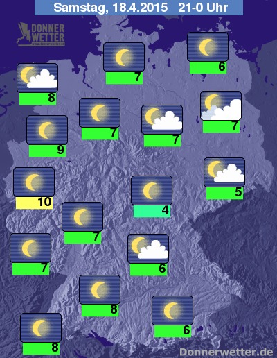 In der Nacht zum Sonntag ist es verbreitet sternenklar, nur im Nordseeumfeld ziehen teils einige Wolken durch, es bleibt überall trocken. Stellenweise bildet sich Nebel oder Dunst. Die Tiefstwerte liegen bei 4 Grad in Freiburg und -2 Grad im Coburger Land.