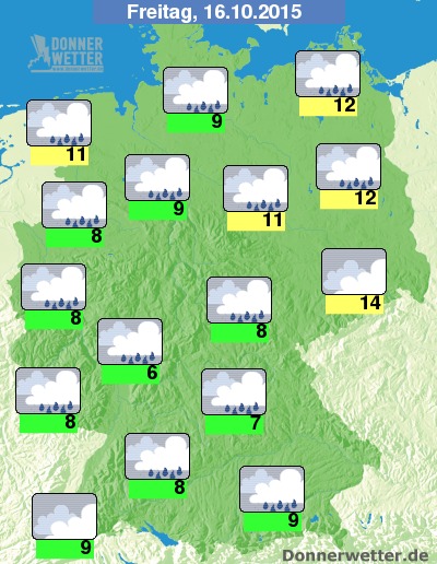 Am Freitag bleibt der Himmel über dem Land weitgehend dicht bewölkt, dazu fällt immer wieder, vor allem im Norden auch teils langanhaltender Regen. Die Temperatur steigt auf nasskalte 6 Grad am Westerwald und bis auf 14 Grad an der Neiße.