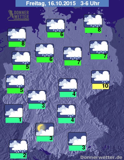 In der kommenden Nacht fällt unter dichten Wolken besonders im Norden und Osten der Republik teils langanhaltender Regen. Im übrigen Bundesgebiet bleibt es ebenfalls weitgehend bedeckt und es fällt auch immer wieder etwas Regen. Am Schwarzwald und am Alpenrand kann der Niederschlag teils auch als Schnee fallen, dabei besteht Glättegefahr. Gebietsweise ist es auch neblig-trüb. Die Temperatur sinkt auf 10 Grad in Dresden und bis 1 Grad in Bliesgau.