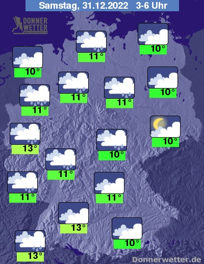 In der kommenden Nacht bleibt der Himmel bedeckt und es fällt zeitweise Regen. Die Tiefstwerte liegen bei teils 13 Grad am Rhein und rund 10 Grad an der Ostsee. Der Wind weht stark bis stürmisch mit Sturmböen, an den Küsten herrscht verbreitet Sturm.