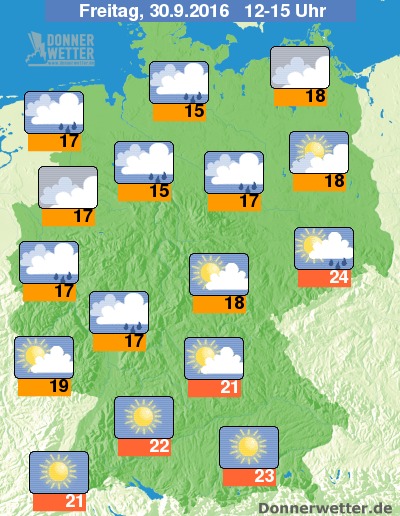 Am Mittag und frühen Nachmittag zeigt sich der Himmel im Südosten heiter bis wolkig - entlang der Donau auch häufig sonnig - und es bleibt trocken. Nordwestlich einer Linie zwischen Taunus und Ostseeküste ist es dagegen stark bewölkt oder bedeckt und einzelne Schauer sind möglich.