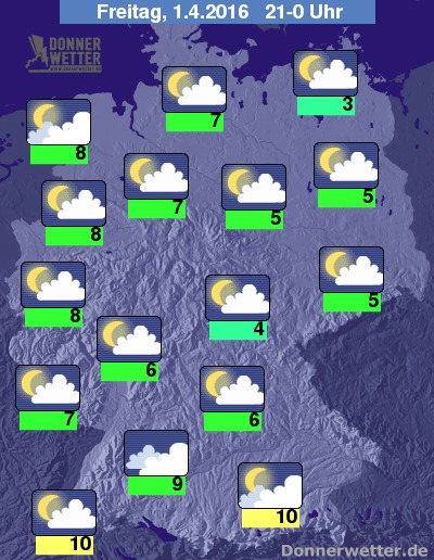 Heute Abend zeigt sich der Himmel meist nur locker, zeitweise aber auch wechselnd bewölkt. Dabei bleibt es landesweit trocken. Die Abendtemperaturen liegen bei 10 Grad in Freiburg und etwa 3 Grad an der Müritz.