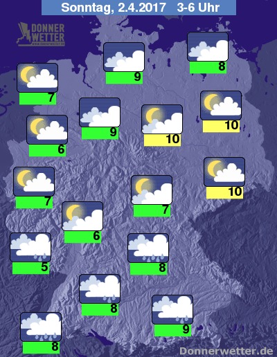 In der Nacht zum Sonntag fällt im Süden unter kompakten Wolken verbreitet Regen. Dichte Wolken halten sich auch vor allem im Ostseeumfeld, dabei sind einzelne Schauer möglich. Im großes Rest der Republik zeigt sich der Himmel weitgehend wechselnd bis aufgelockert bewölkt und es bleibt trocken. Die Temperatur sinkt auf 10 Grad in Berlin und bis 5 Grad im Saargau.