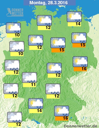 Am heutigen Ostermontag ist es nach Osten hin zunächst häufig aufgelockert, zum Teil stark bewölkt und dazu trocken, im übrigen Land ziehen aus Westen her jedoch meist dichte Wolken durch und es fällt häufig, zum Teil kräftiger Regen. Am Nachmittag bilden sich bevorzugt über der Westhälfte einzelne Schauer und regional auch kurze Gewitter. Die Temperatur steigt auf 10 Grad an der Nordsee und bis 16 Grad in Dresden. Im Norden und Westen weht ein teils stürmischer Wind, an der Nordsee herrscht Sturm.