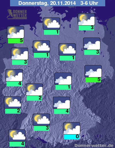 In der folgenden Nacht ist es vor allem im Osten noch häufig dicht bewölkt, aber weitgehend trocken, sonst zieht zumeist lockere bis aufgelockerte und nur hier und da auch dichte Bewölkung durch, dabei bleibt es trocken. Im Südosten bildet sich stellenweise Nebel oder Hochnebel, dabei kann es bei Temperaturen um den Gefrierpunkt gefährlich glatt werden. Die Temperaturspanne reicht von etwa 5 Grad an der Nordsee bis 0 Grad im Raum München.