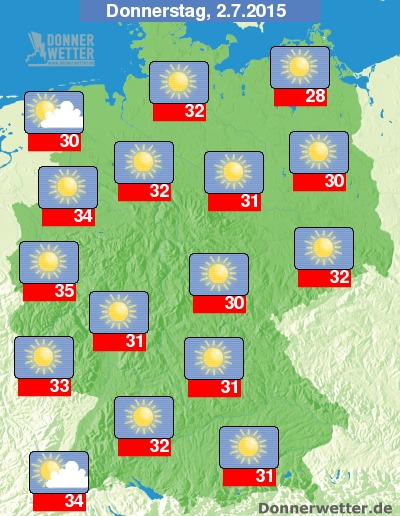 Am Donnerstag scheint wiederum die Sonne von einem überwiegend wolkenlosen und blauen Himmel. Jedoch können im Nordwesten und auch gebietsweise rund um den Schwarzwald hier und da ein paar Quellwolken aufziehen, dazu besteht ein leichtes Schauer- und Gewitterrisiko. Die Höchstwerte erreichen sommerliche 28 Grad an der Müritz und drückend heiße 35 Grad in der Kölner Bucht.