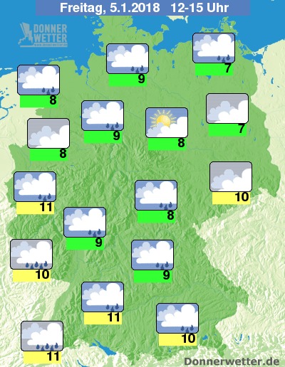Über Mittag regnet es meist nur leicht und insbesondere im Nordosten bleibt es vielerorts auch trocken. Etwas kräftigerer Regen fällt nur entlang des Rheins. Dazu muss vor allem an den Küsten und in den höheren Lagen der Mittelgebirge nach wie vor mit Sturmböen gerechnet werden.