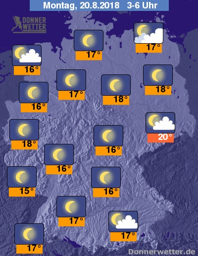 In der Nacht zum Montag sind am Alpenrand anfangs letzte Schauer und Gewitter möglich, sonst zeigt sich der Himmel schon überwiegend sternenklar, vor allem an den Küsten auch teils wolkiger, aber trocken. Die Temperatur sinkt auf 20 Grad in Dresden und etwa 15 Grad in Saarbrücken.