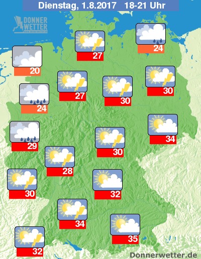 Heute Abend ist es nur über dem Südosten Deutschlands sowie über Sachsen noch meist heiter bis wechselnd bewölkt und weitgehend trocken, sonst ziehen hingegen überwiegend dichte Wolken übers Land hinweg und es bilden sich verbreitet Schauer und nicht selten auch Gewitter. Die Temperatur liegt bei 20 Grad in Bremerhaven und noch bis 35 Grad in München.