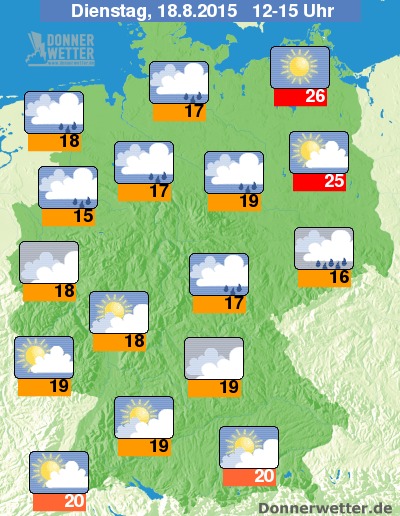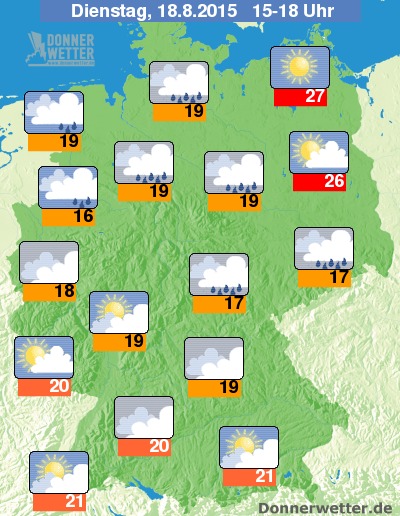 Am Dienstag Nachmittag regnet es in Niedersachsen, Thüringen und Hamburg verbreitet. Vor allem an Ober- und Mittelrhein sowie im äußersten Nordosten kann sich am Nachmittag auch häufiger mal die Sonne zeigen.