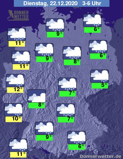 In der Nacht ist es überall dicht bewölkt und es fällt immer wieder, teils auch langanhaltender Regen. Die Temperatur steigt während der Nacht auf etwa 5 Grad in der Lausitz und bis milde 12 Grad im Rheinland.