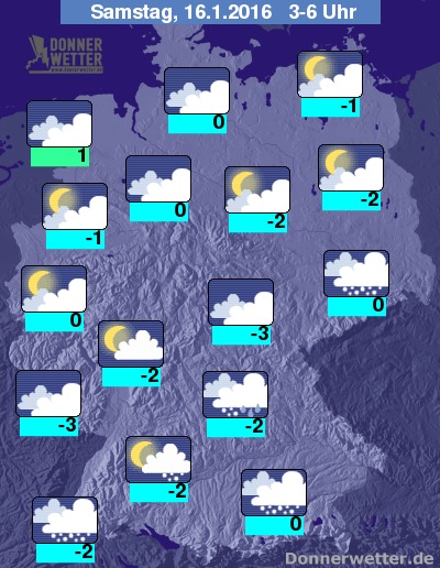In der Nacht zum Samstag fällt im Alpenvorland häufig Schnee, auch im übrigen Süden sowie in Sachsen kann hier und da noch Schnee fallen. Es besteht entsprechende Glättegefahr! Im übrigen Bundesgebiet ist es oft stark, vor allem in einem breiten Streifen von Hessen bis nach Berlin-Brandenburg auch oft aufgelockert bewölkt, dazu bleibt es weitgehend trocken. Die Temperatur sinkt auf 1 Grad in Wittmund und etwa -3 Grad im Saargau.