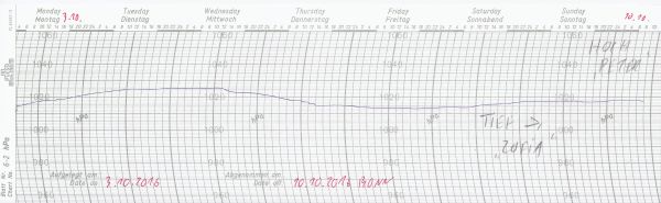 Mit herbstlichen Temperaturen starten wir in diese neue Woche. Unser Schrieb dokumentiert den Luftdruckverlauf zwischen dem 03.10. und dem 10.10.2016 an unserer Wetterstation in Bonn.