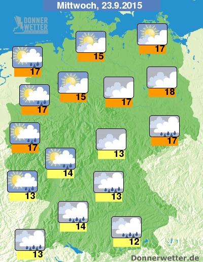 Am Mittwoch bleibt der Himmel über der gesamten Südosthälfte Deutschlands weitgehend verschlossen, dabei bleibt es vom Nordosten bis in die Mitte des Landes weitgehend trocken, im Osten fällt nur gebietsweise etwas Regen, im Süden fällt hingegen, insbesonders an den Alpen noch zeitweise und teils langanhaltender Regen. Im Westen und Nordwesten ist es häufig stark, hier und da aber auch aufgelockert bewölkt, es bilden sich zeitweise Schauer, örtlich sind sogar kurze Gewitter möglich. Die Temperatur steigt auf 12 Grad in München und bis etwa 18 Grad in Berlin.