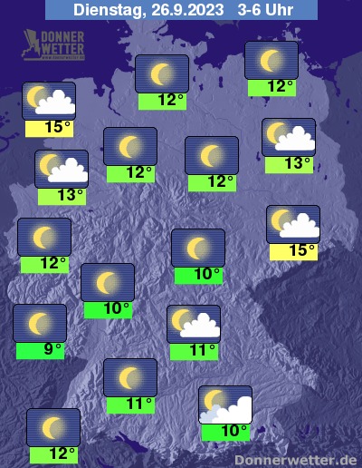 In der kommenden Nacht zeigt sich der Himmel zumeist sternenklar und ansonsten locker bewölkt. Es bleibt trocken bei Tiefstwerten von 15 Grad in Dresden und 9 Grad in Saarbrücken.