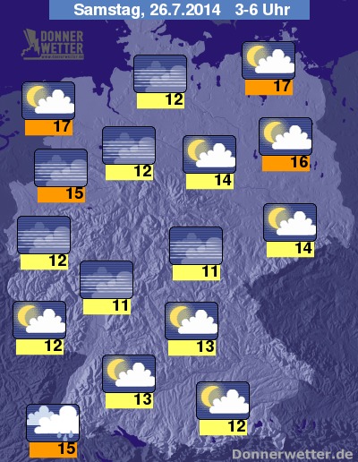 In der Nacht klingen die Schauer und letzten Gewitter auch im Norden nach und nach ab, sonst ist es bereits meist aufgelockert bewölkt, gebietsweise auch klar und es bleibt weitgehend trocken. Die Temperatur sinkt auf 17 Grad an der Ostsee und 11 Grad im Westerwald.