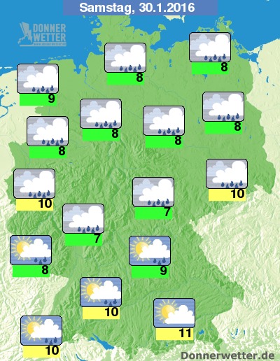 Heute ist es im Süden des Landes anfangs noch oft locker oder aufgelockert bewölkt und dazu trocken. Im übrigen Bundesgebiet zeigt sich der Himmel dagegen bedeckt und zum Teil fällt kräftiger und auch langanhaltender Regen. Die Temperatur steigt auf 7 Grad in Unterfranken und bis 10 Grad im Breisgau. Es weht oft starker, zum Teil auch stürmischer Wind, auf den Bergen und an der See herrscht teils Sturm.