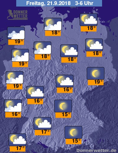 Während der zweiten Nachthälfte frischt der Wind vor allem in der Nordwesthälfte auf und die Bewölkung nimmt allmählich zu. Sonst bleibt es sternenklar oder nur leicht bewölkt. Der teils lebhaftere Wind hält die Temperaturen häufig im lauen Bereich zwischen 16 und 19 Grad. In Gebieten Bayerns kann sich die Luft bei meist nur schwachen Wind auf stellenweise unter 15 Grad abkühlen.