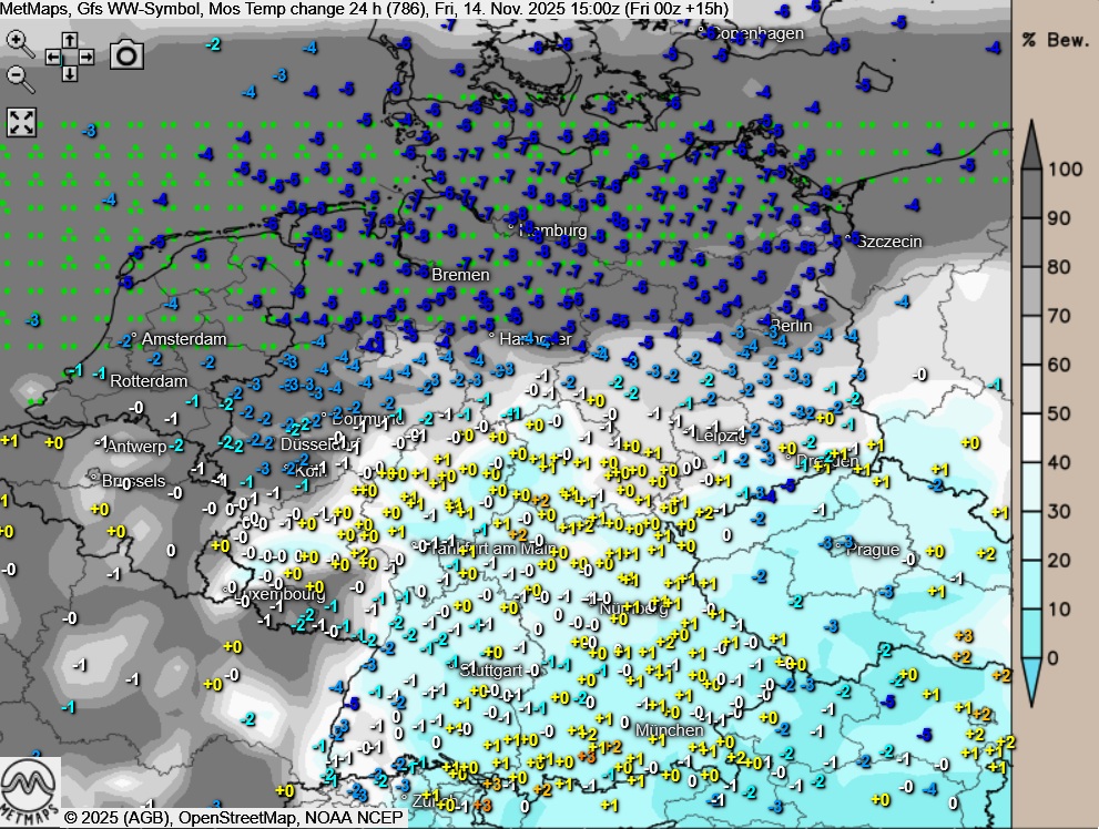 Die Lufttemperaturen am Freitagnachmittag sowie die 24-Stunden-Temperaturveränderung um 15 Uhr nach GFS: