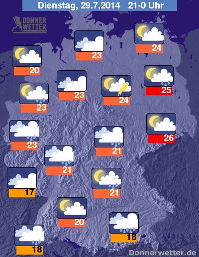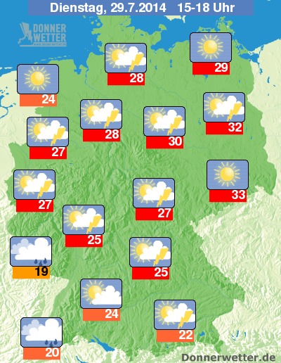 Heute Mittag und Nachmittag ziehen über die Mitte und den Süden dichte Quellwolken auf und es können sich verbreitet schwere Gewitter, zum Teil mit heftigem Unwetterpotential, bilden. Den meisten Sonnenschein erwarten wir für das gesamte Küstenumfeld, aber auch andernorts kann sich neben zahlreichen Wolken auch immer wieder die Sonne zeigen. Die Temperatur liegt bei kühlen 19 Grad am Hunsrück und schweißtreibenden 33 Grad in der Lausitz.