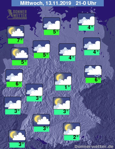 Während der zweiten Nachthälfte zeigen sich regional gelegentlich Mond und Sterne, sonst dominieren die Wolken, Niederschlag fällt jedoch kaum noch. Im Süden bilden sich stellenweise Nebelfelder.