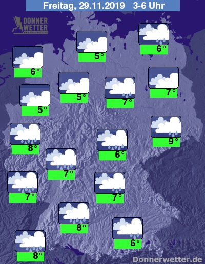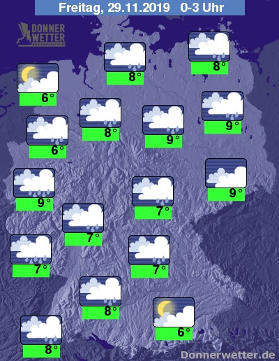 In der Nacht auf Freitag ist der Himmel meist stark bewölkt oder bedeckt, regionale Auflockerungen beschränken sich auf die erste Nachthälfte und das Nordseeküstenumfeld sowie den Alpenrand. Verbreitet muss in den nächsten Stunden mit Schauern gerechnet werden, in der Nordhälfte lassen die Schauer in den frühen Morgenstunden allmählich nach.