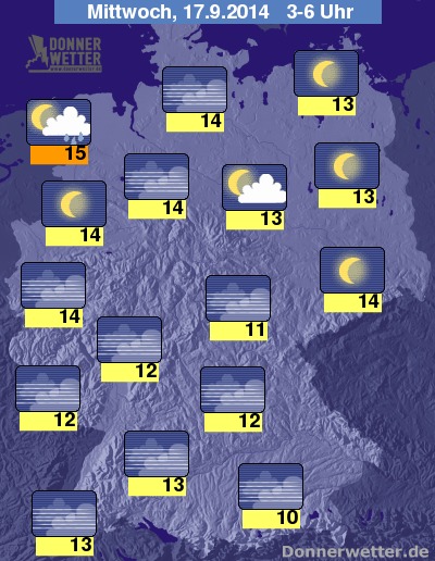 In der Nacht zum Mittwoch bleibt es am Himmel vielfach wolkenlos oder es zieht nur lockere Bewölkung durch. Besonders im Bereich der Flusstäler kann sich jedoch gebietsweise Nebel oder Dunst bilden. Dazu bleibt es, mit Ausnahme der ostfriesischen Küste, trocken. Die Temperatur sinkt auf 15 Grad in Ostfriesland und etwa 10 Grad im Allgäu.