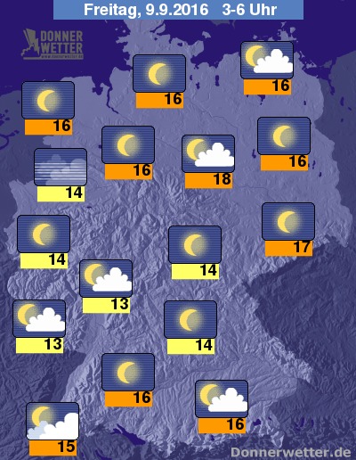 In der Nacht zum Freitag ist der Himmel verbreitet sternenklar. Einige, meist lockere Wolken können vor allem über den Südwesten, hier und da aber auch über den Norden des Landes hinwegziehen, dazu bleibt es trocken. Die Temperatur sinkt auf 18 Grad in Magdeburg und bis 13 Grad im Saargau.
